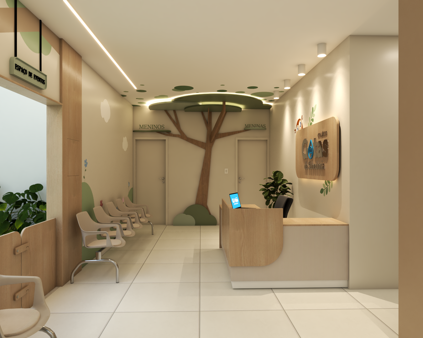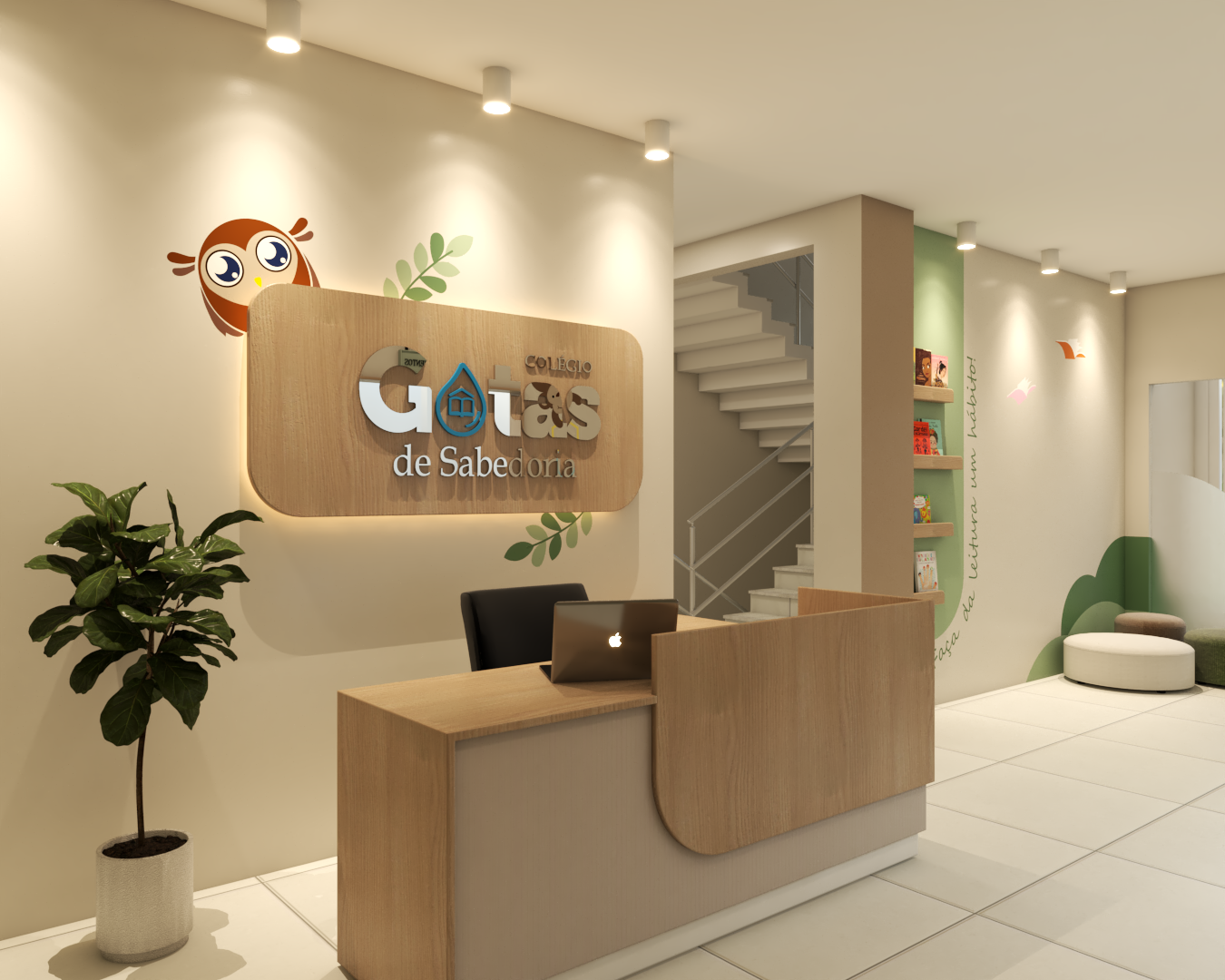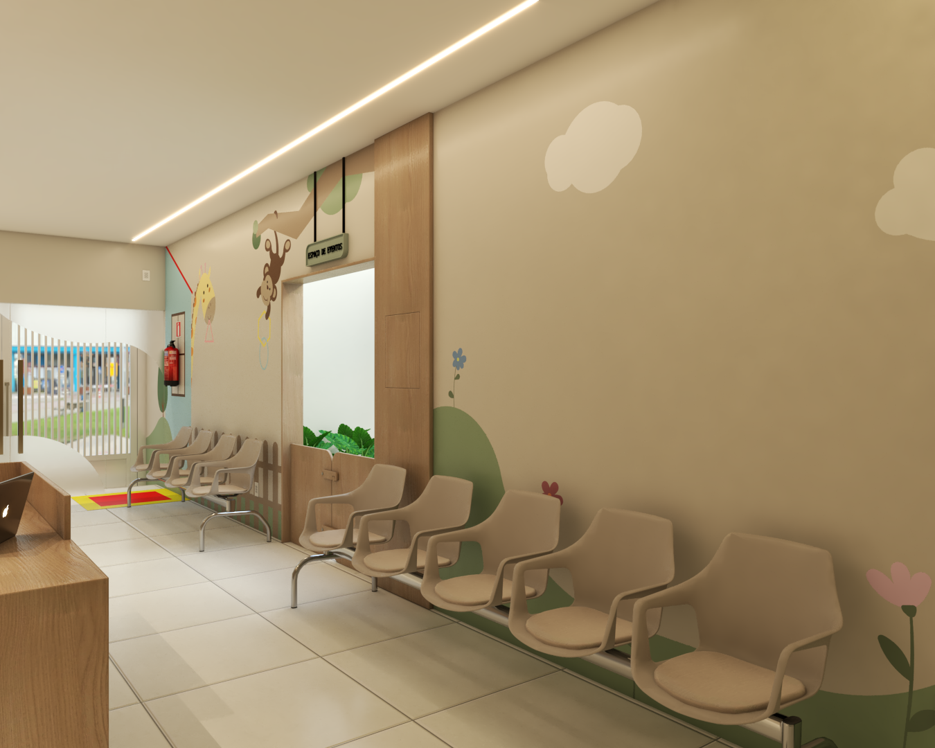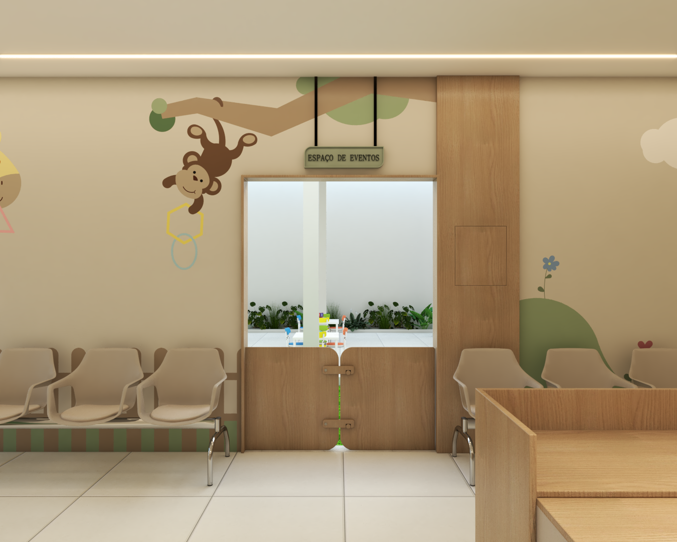 Com áreas de recepção, espera e um cantinho especial para leitura, o ambiente foi inspirado em uma floresta
