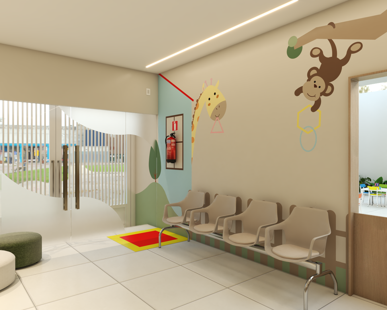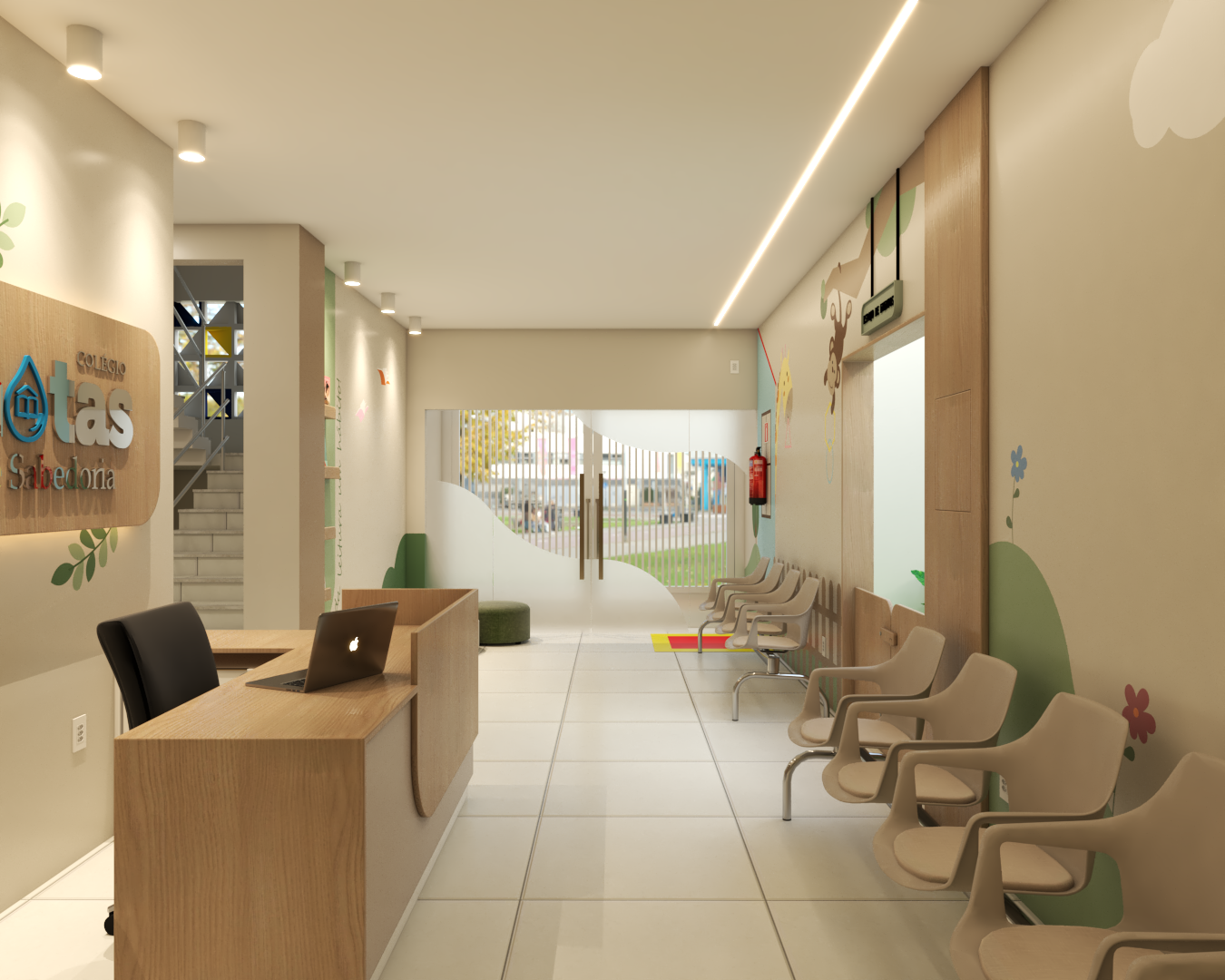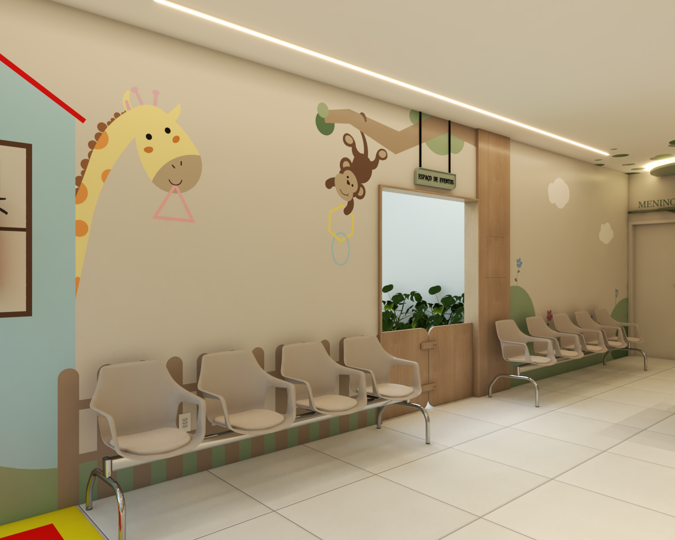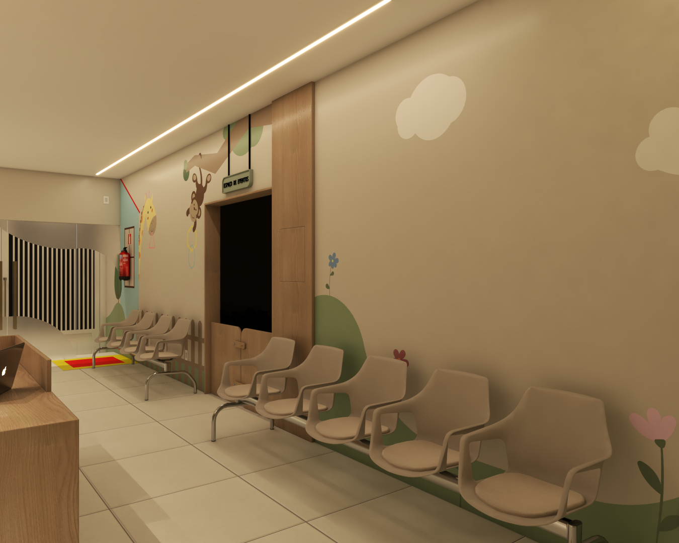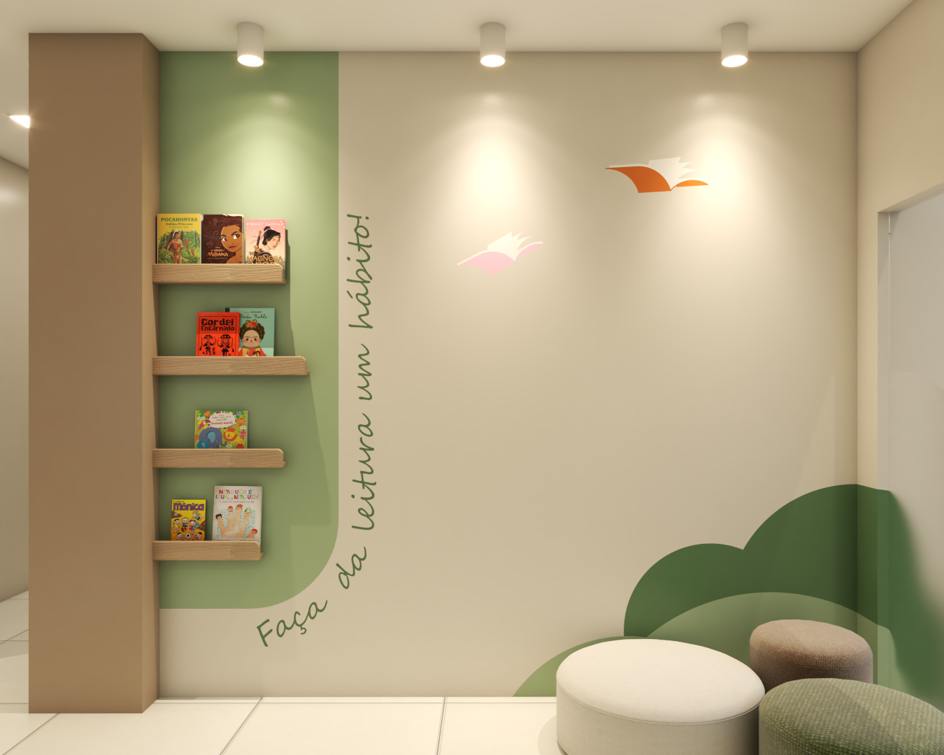 Com áreas de recepção, espera e um cantinho especial para leitura, o ambiente foi inspirado em uma floresta